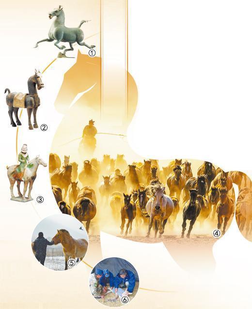 图①:东汉铜奔马。图②:汉代彩绘木马。图③:唐三彩男骑马俑。以上图片均为甘肃省博物馆提供 图④:夕阳下奔跑的马群。王德生摄 图⑥:工作人员看护小马驹。大青山自然保护区管理局供图