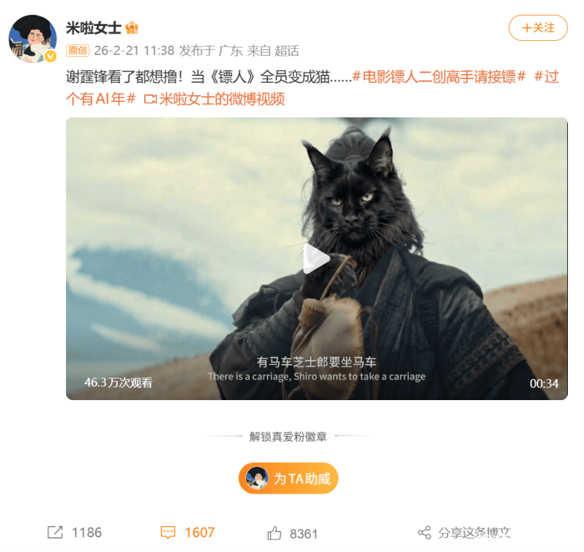 国士待之,国士报之,「镖人」的大方,激发了不断涌现的二创盛筵,为影片的宣发赚足了群众基础,而全员变猫的爆款AI视频,更是圈进来了一大波路人粉。
