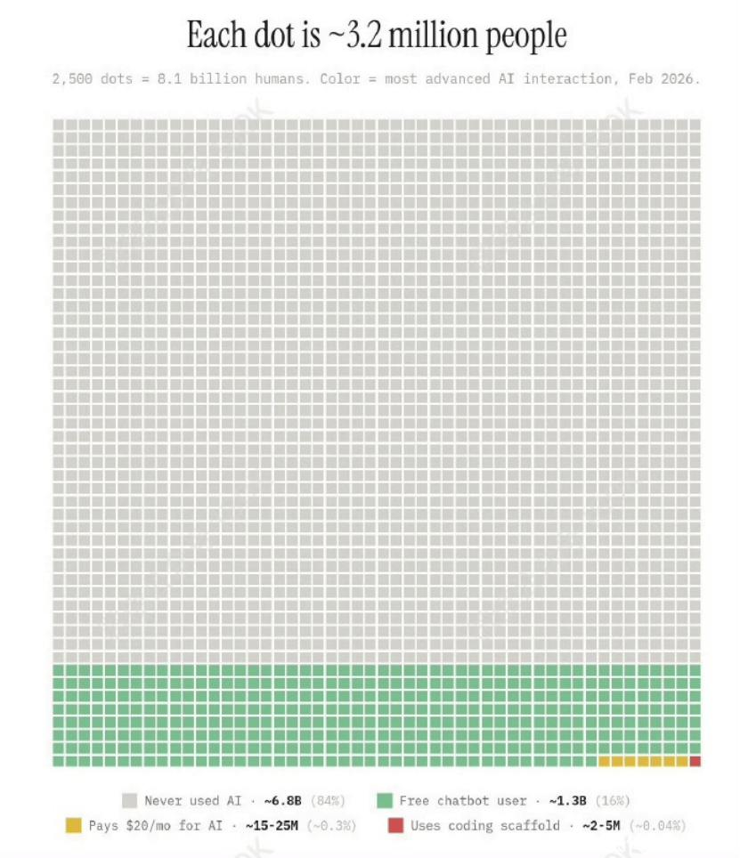 同一时期,根据Data Reportal的一份统计报告显示,世界上有68亿人——相当于全球人口的84%——从未使用过任何AI应用,能为AI付费的用户,更是只占到区区0.3%,就是这么寒酸。