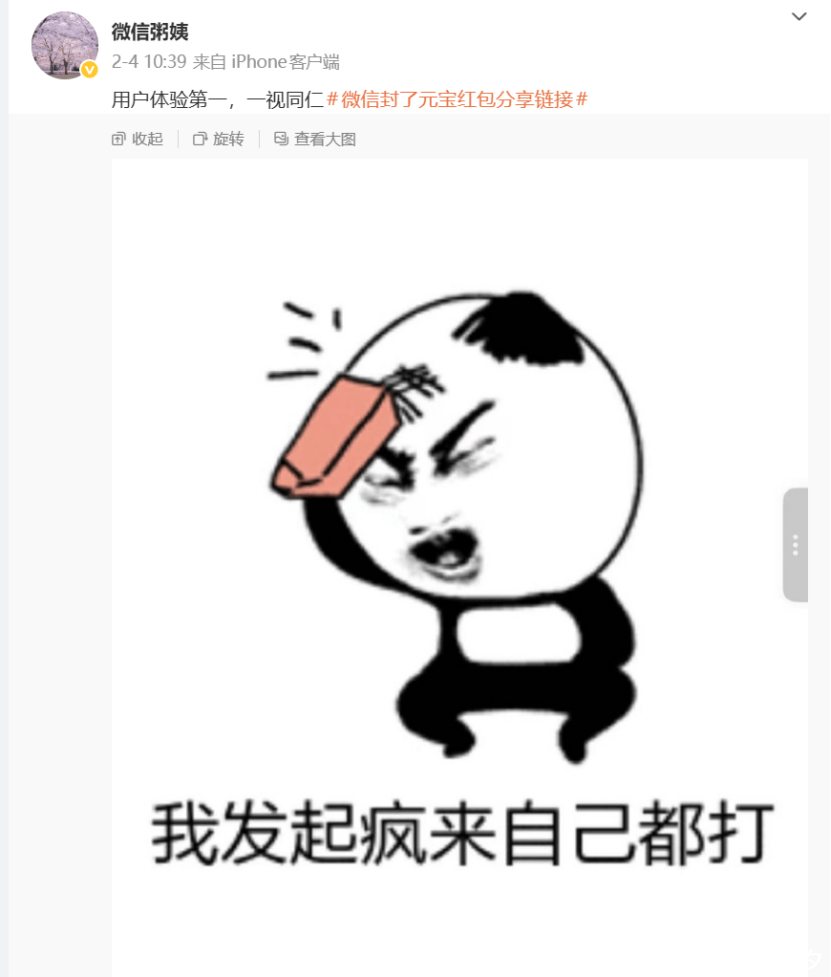 比如在选择封杀元宝的红包链接之后,微信也得第一时间让公关总监找回她的微博账号,把官方解释和一张「我发起疯来连自己都打」的表情包发了出来。